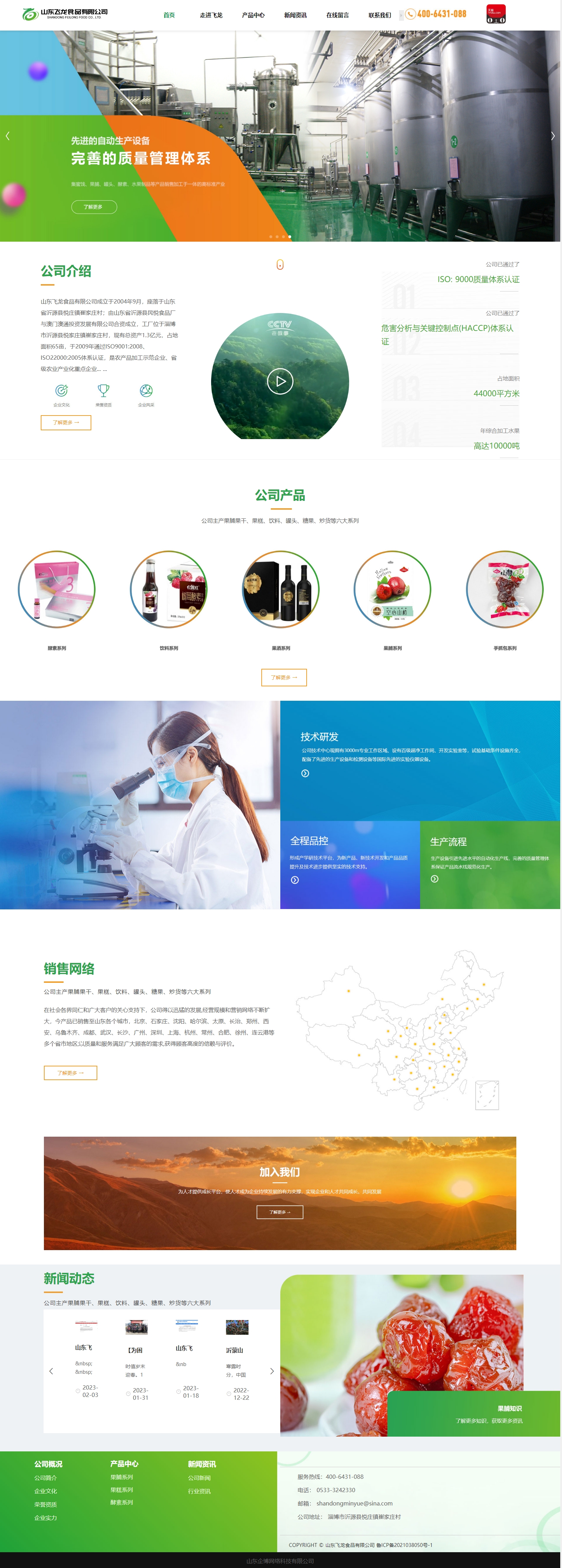 山东飞龙食品有限公司成立于2004年9月,座落于山东省沂源县悦庄镇崔家庄村;由山东省沂源县民悦食品厂与澳门澳通投资发展有限公司合资成立,其注册资本1100万元。公司占地面积44000平方米,建筑面积24000平方米;固定资产1.3亿元;现有职工532人;年综合加工各种水果10000吨。主要有果脯生产线4条、果糕生产线2条、冻干生产线1条,低温油炸生产线1条,罐头生产线1条,年产6000吨饮料生产线1条,年产5000吨酵素生产线1条;果脯系列产品有:空心山楂、野酸枣、阿胶枣、苹果脯、黄桃干、柠檬片等;果糕系列产品有;山楂片、果丹皮、无添加山楂条等;酵素系列产品有:酵素口服液、片剂、冻干粉、酵素饮品等几十个产品。产品先后进入上海来伊份股份有限公司 、沃尔玛超市、乐购、利群、家乐福、济南大润发、淄博商厦超市等。公司已通过ISO9001:2008、ISO22000:2006体系认证,有一套完整的质量保证体系。公司注册商标“来懿品”被山东省工商行政管理局认定为“山东省著名商标”;公司被认定为“山东省食品卫生等级**单位”;先后获得“省级扶贫龙头企业”、“国家级林业产业化龙头企业”、“山东省农业产业化龙头企业”、“山东省守合同重信用企业”、“淄博市文明诚信民营企业”、“淄博市消费者喜爱品牌”“第十一届中国林产品交易金奖”、“山东森林食品推荐品牌”等荣誉称号。